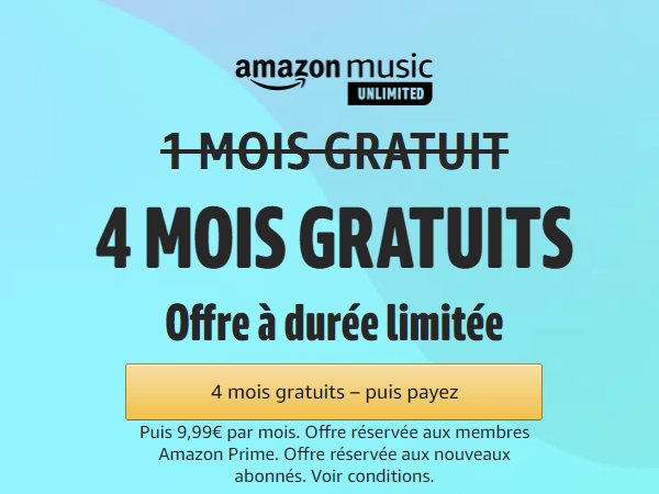 Amazon propose de tester son service Amazon Music Unlimited gratuitement pendant 4 mois, cette offre est réservée aux nouveaux abonnés qui sont membres Amazon Prime.