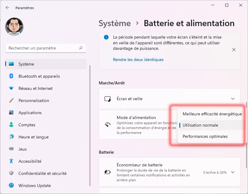Windows 11 propose trois modes de fonctionnement, permettant de choisir de privilégier les performances, ou l’autonomie de votre ordinateur.