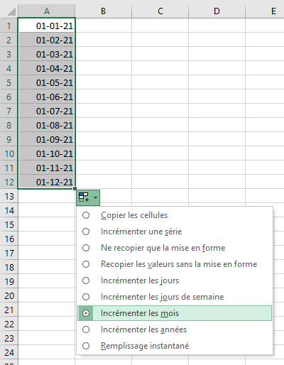 « Incrémenter les jours ouvrés » donne le même résultat, mais sans le samedi et dimanche, qui ne sont pas des jours ouvrés.