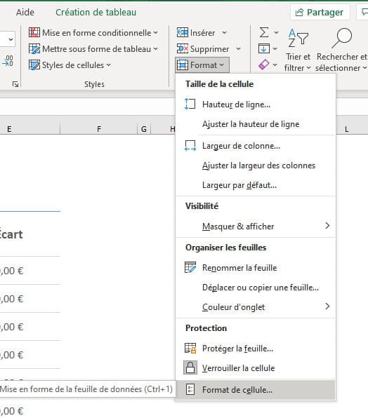 Voici comment faire, sélectionnez les cellules modifiables dans votre tableau, puis rendez-vous dans l’ongle Accueil, Format, Format de cellules.