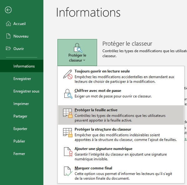 Maintenant, il ne reste plus qu’à protéger le document en vous rendant dans le menu Fichiers, Informations, Protéger le classeur, Protéger la feuille active.