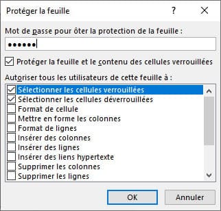 Indiquez le mot de passe de la feuille, laissez les cases « Sélectionner les cellules verrouillées » et « Sélectionner les cellules déverrouillées » cochées. Puis validez en cliquant sur OK.