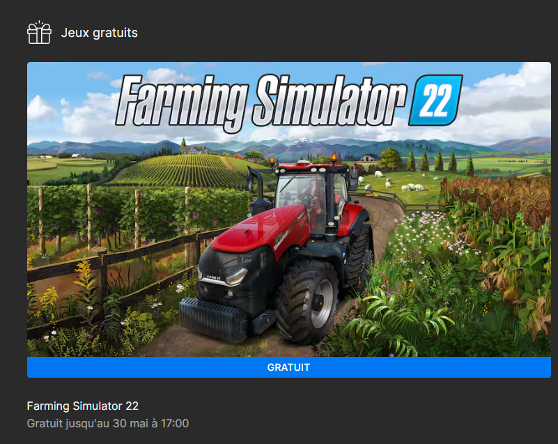 Pour ceux que ça intéresse, le jeu Farming Simulator 22 est gratuit jusqu'au 30/05/2024 sur Epic Games