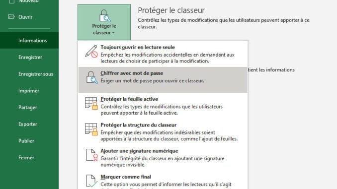 Voici comment procéder, ouvrez votre document et rendez-vous dans le menu Fichier => Informations. Puis sur Protéger le classeur (ou document s’il s’agit de Word), Chiffrer avec mot de passe.