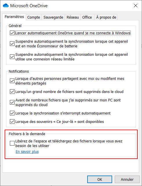 Dans l’onglet Paramètres, décochez la case devant : Libérez de l’espace et téléchargez des fichiers lorsque vous avez besoin de les utiliser.