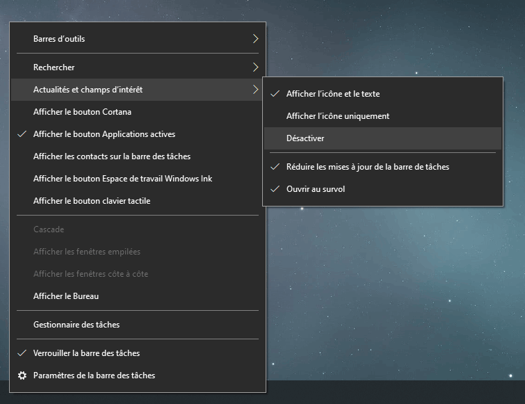 Faites un clic droit au milieu de la barre des tâches (dans une zone vide). Ensuite, dans Actualités et champs d’intérêt, cochez Désactiver.