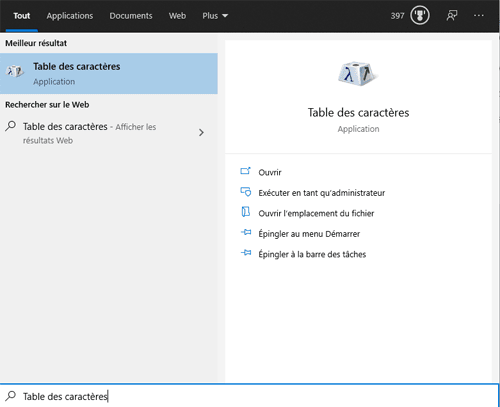 Heureusement sur Windows, il y a un outil qui va nous aider, c’est la table des caractères. Cet outil est accessible via la recherche du menu démarrer. Entrez tout simplement Table des caractères dans le champ de recherche.