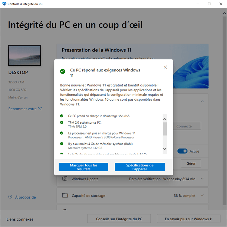 Notez que vous devrez peut-être activer TPM 2.0 dans le bios pour que votre pc passe le test avec succès.