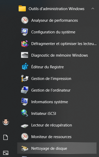 Pour lancer l’outils de nettoyage, rendez-vous dans le menu démarrer, Outils d’administration Windows, Nettoyage de disque.