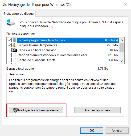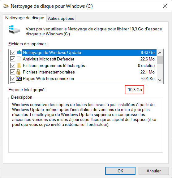 Sélectionnez toutes les rubriques pour faire le grand ménage, vous aurez une indication sur l’espace disque utilisé par les fichiers temporaires.