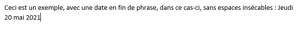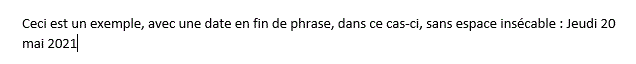 Un espace insécable est un espace entre deux mots ou chiffres, qui ne peut pas être coupé s’il se trouve en fin de phrase. Le groupe de mots ou chiffres devra donc toujours resté en un bloc. Ceci peut être utilisé, par exemple, pour les dates.