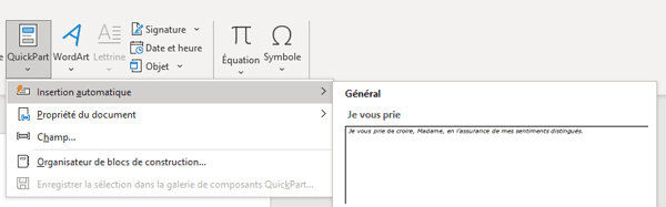 Pour insérer une phrase type dans votre document, rendez-vous dans l’onglet Insertion, QuickPart, Insertion automatique. Vous aurez accès à toutes vos phrases enregistrées, choisissez la phrase désirée dans la liste.